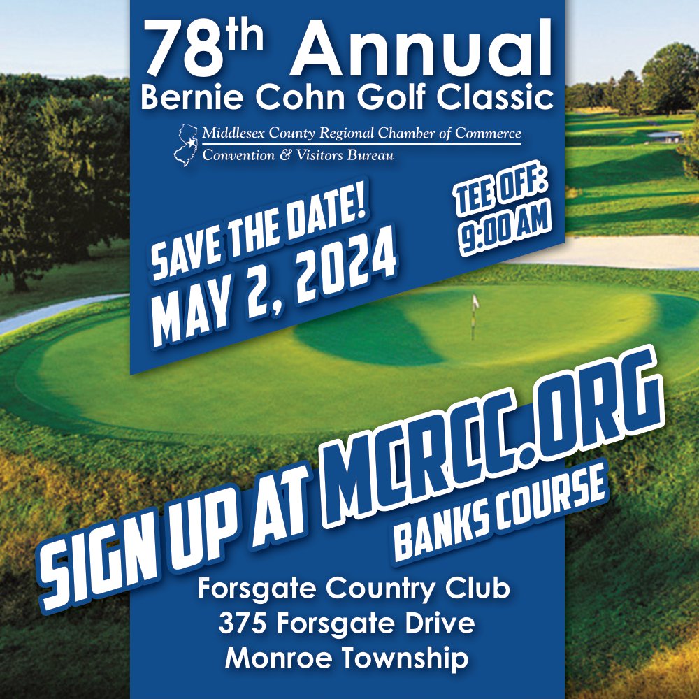 You’re invited to our Bernie Cohn Memorial Golf Classic and 78th Annual Outing on Thursday, May 2, 2024, 7:30 AM at the Forsgate Country Club in Monroe Township. Each year our Annual Golf Classic serves as an opportunity for the business and community leaders of Middlesex County to connect while supporting the Chamber’s efforts to improve Middlesex County.