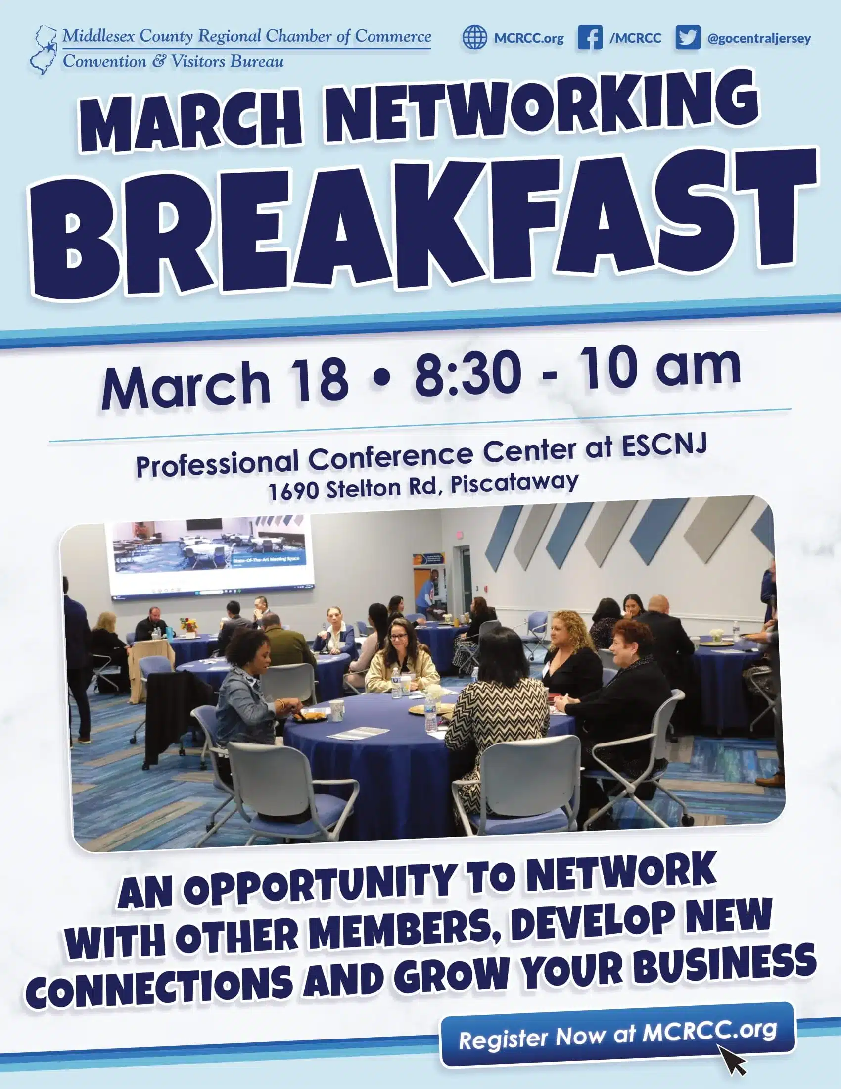 Join the Middlesex County Regional Chamber of Commerce for our March Networking Breakfast on Tuesday, March 18th at the Professional Conference Center at ESCNJ, 1690 Stelton Rd. in Piscataway.
